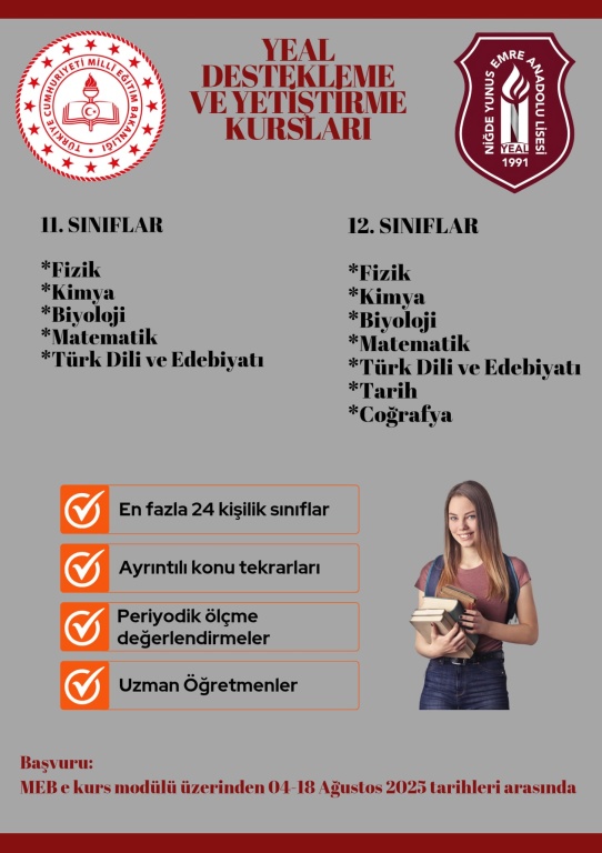 Okulumuz, Niğde İl Milli Eğitim Müdürlüğü tarafından Destekleme ve Yetiştirme Kurs Merkezi olarak belirlenmiştir. 11. ve 12. sınıf öğrencilerimize yönelik YKS hazırlık kursları açılacaktır. Öğretmenlerimiz ve öğrencilerimizin başvuru yapması gerekmektedir.